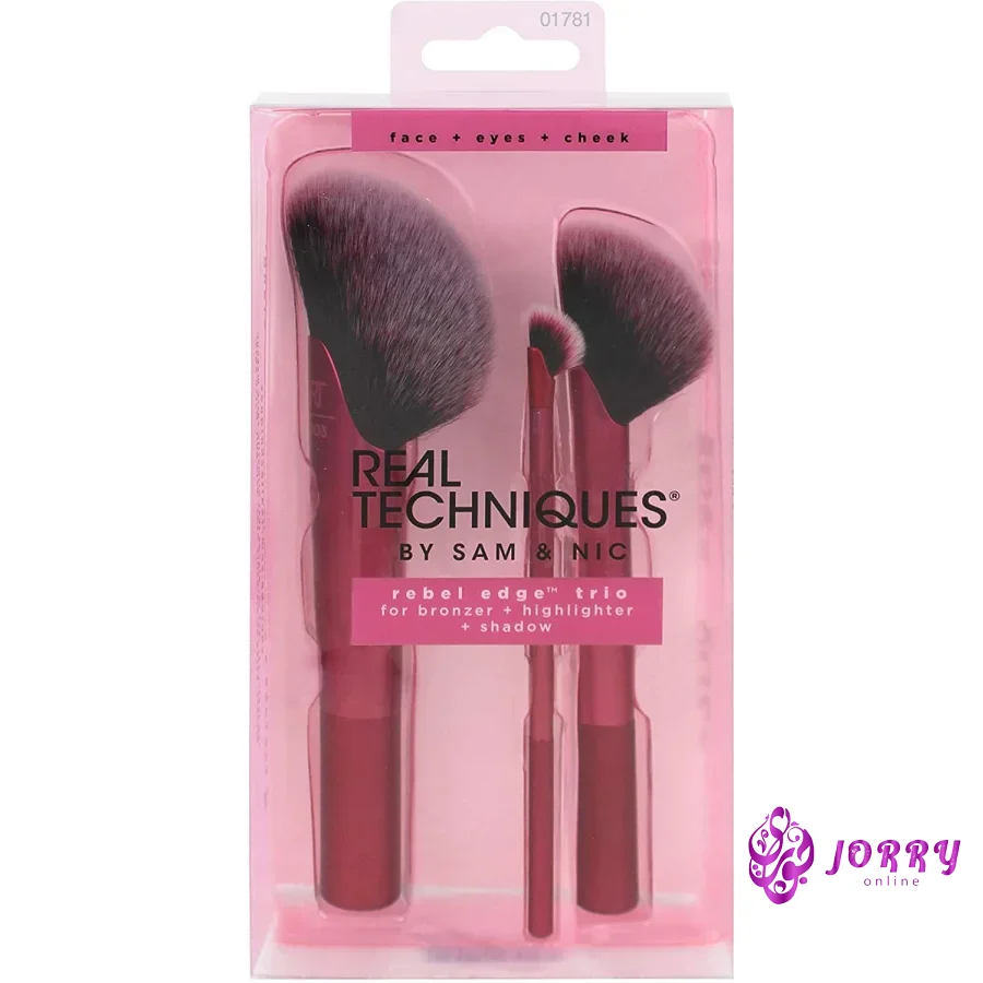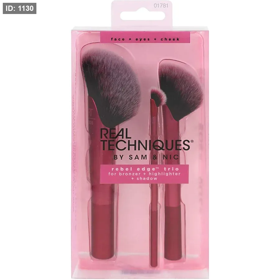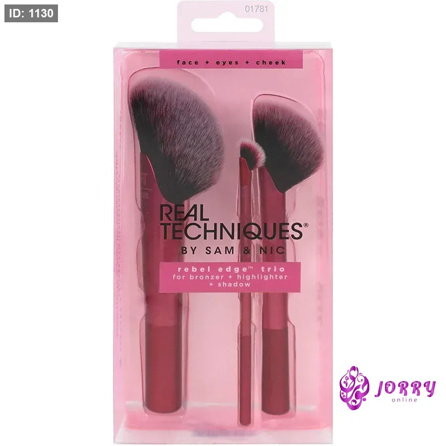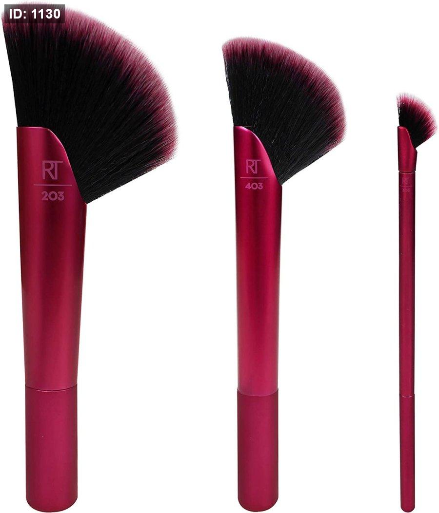 Contains: Broad cut brush for face (foundation or bronzer). Fine cut brush for eyes. Medium cut brush for cheek (highlighter or blush)