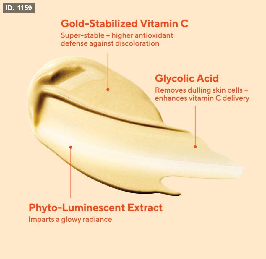 تم تصميم هذا المصل عالي التقنية مع مجمع Vita C المميز الذي يجمع بين حمض الأسكوربيك L النقي المستقر بالذهب للحصول على دفاع مضاد للأكسدة أعلى بنسبة 55٪ من فيتامين C التقليدي وأسكوربات Tetrahexyldecyl (THD) لامتصاص ممتاز لفيتامين c و Glutathione لفوائد البشرة الممتدة. تم إثراء هذه التركيبة المتقدمة بحمض الجليكوليك الذي يسرع عملية تجديد الخلايا ودورانها للكشف عن بشرة أكثر نضارة ومتوهجة، وكذلك بمستخلص فيتو مضيء لضمان توهج البشرة الفوري.