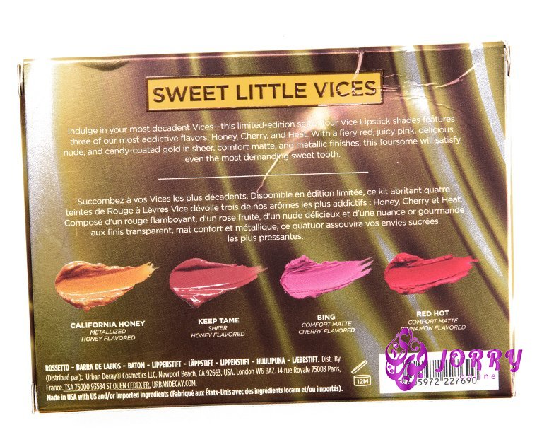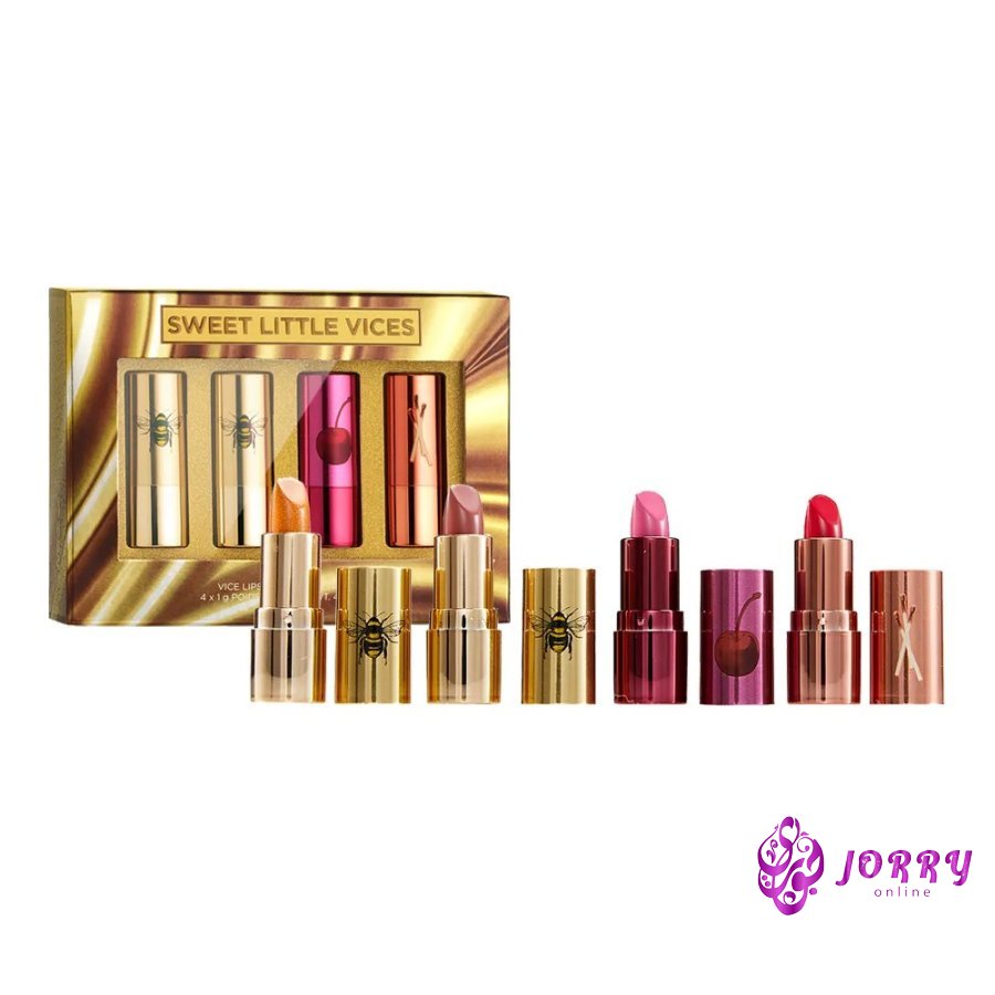 Get hooked on honey. This Vice Lipstick set features four mini limited-edition shades in three addictive flavors: sweet honey, juicy cherry, and cinnamon heat in sheer, comfort matte, and metallic finishes. Just one swipe provides an unbelievable laydown of smooth, high-pigment color, with zero dragging or skipping.
