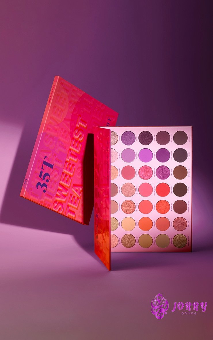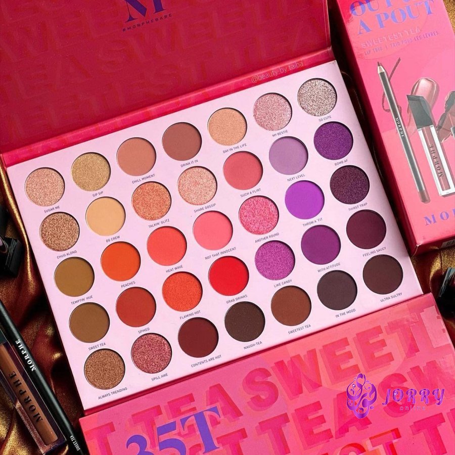 Create the looks you crave - from oh-so-sweet to full-on heat - with MORPHE's 35T Sweetest Tea Artistry Palette packed with 35 mattes and shimmers. Shades Row 1: Sugar Me (light peach shimmer), Sip Sip (deep gold shimmer), Chill Moment (matte mauve pink), Drink It In (matte dusty rose), Day In The Life (light coral shimmer), My Bestie (pink shimmer), So Cute (deep champagne pink shimmer) Row 2: Chug Along (copper shimmer), OG Crew (matte apricot), Talkin' Glitz (golden peach shimmer), Share Gossip (coral shimmer), Such A Flirt (matte peach), Next Level (matte lavender), Bomb AF (electric purple shimmer) Row 3: Temptin' Hue (matte mocha), Peaches (matte orange), Heat Wave (matte vibrant orange), Not That Innocent (matte vibrant coral), Another Round (hot pink shimmer), Throw A 'Fit (matte magenta), Thirst Trap (deep purple shimmer) Row 4: Sweet Tea (matte mocha brown), Spiked (matte brick), Flaming Hot (orange shimmer), Grab Drinks (matte red-orange), Like Candy (magenta shimmer), With Attitude (matte purple), Feeling Saucy (matte wine) Row 5: Always Trending (bronze shimmer), Spill Awe (maroon shimmer), Contents Are Hot (matte maroon), Naugh-tea (matte deep brown with sparkle), Sweetest Tea (matte chestnut brown), In The Mood (matte plum), Ultra Sultry (matte mulberry)