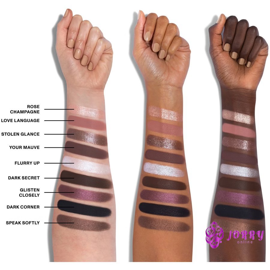 Colorrosy champagne, rose, icy plum, mauve, icy white, dark chocolate, deep purple, black, cool brown